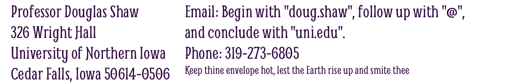 Good afternoon, and welcome to my webpage. I joined the UNI faculty in 1999, and am proud to be at an institution that values excellent scholarship and excellent teaching. Lately, I've been writing about the Prisoner's Dilemma, Graph Theory, and using IBL techniques to teach Math for Liberal Arts courses. In addition to teaching mathematics, I coach improv, and serve on the Cedar Falls school board.